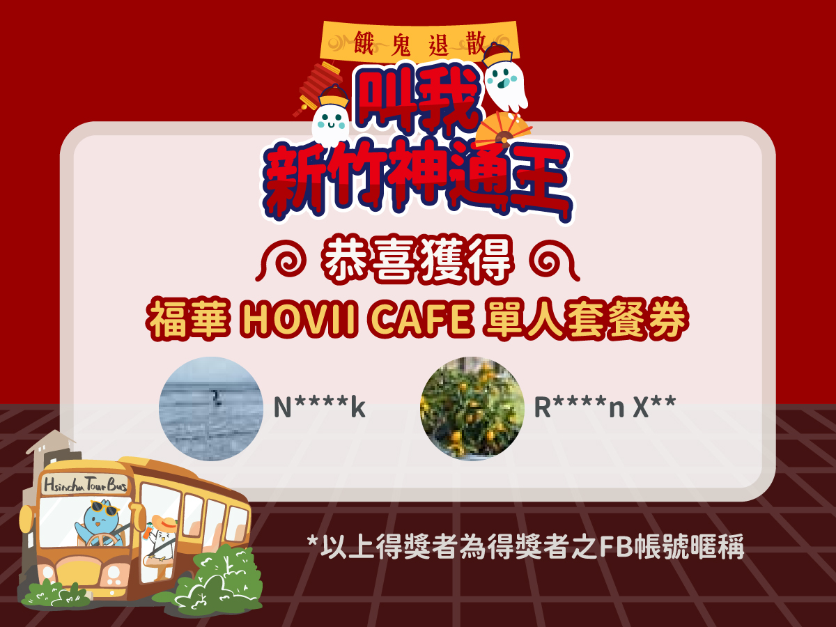 感謝大家熱情參與🙌 福華 HOVII CAFE 單人套餐券 🎁 幸運得主出爐啦! 恭喜以下得獎者獲得 福華 HOVII CAFE 單人套餐券 1 張 🍴 請得獎者於 9/30 前私訊粉專小編,提供姓名與聯絡方式,以便安排領獎事宜。 感謝大家和城編一起感受「中元城隍祭」的魅力⚡ 沒中獎的朋友別氣餒,現在搭巴士玩線上活動還可以兌換限量紀念玻璃杯,千萬別錯過💙