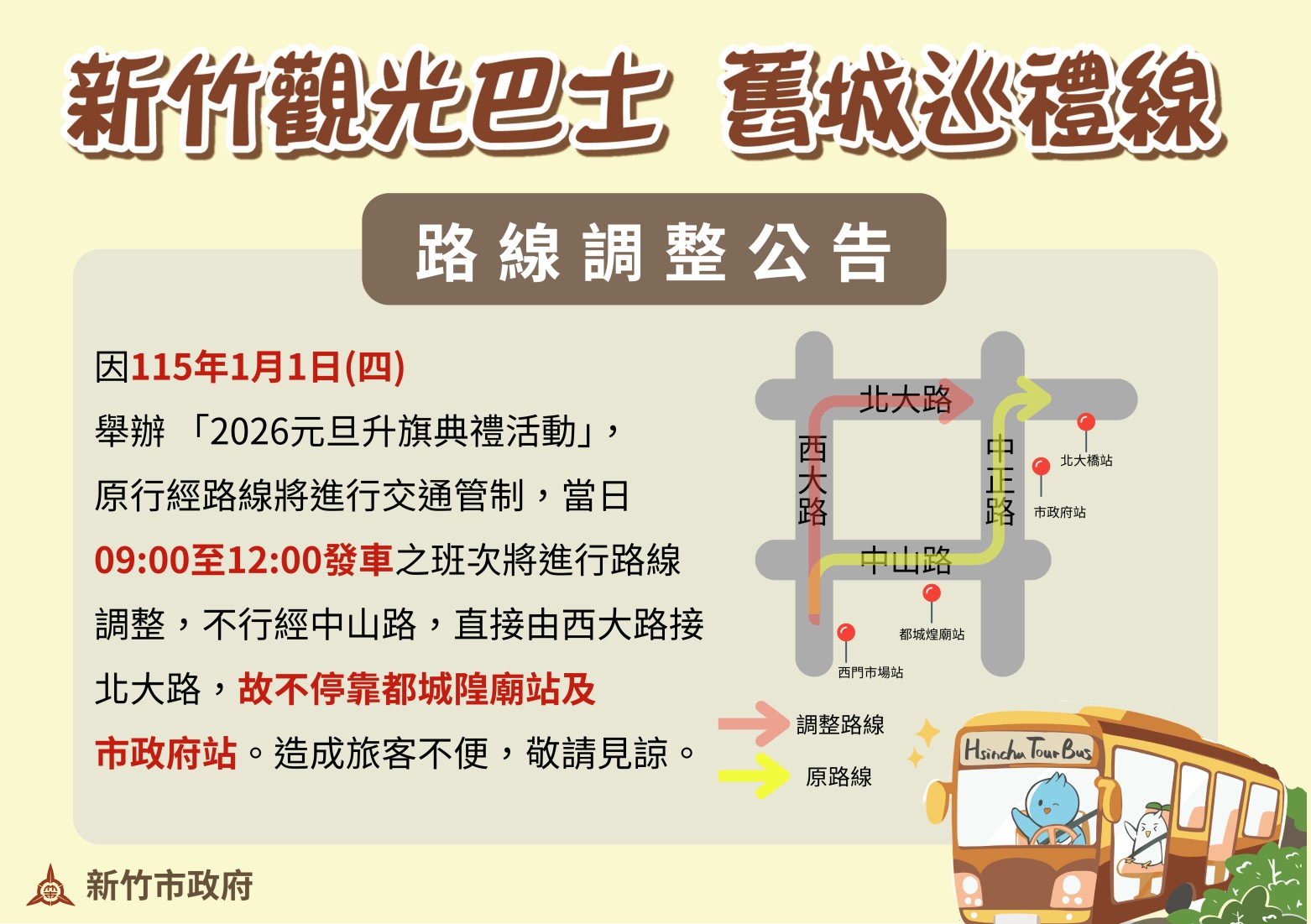 為配合元旦升旗典禮活動,新竹觀光巴士在當天將會做部分時段的路線調整 巴士路線調整內容: 🔸 班車將不行經中山路,直接由西大路接北大路 🔸 不停靠都城隍廟站及市政府站 調整班次: 🔸115年1月1日 (四) 上午9點至上午12點發車班次,於上午12點過後發車班次正常行駛。